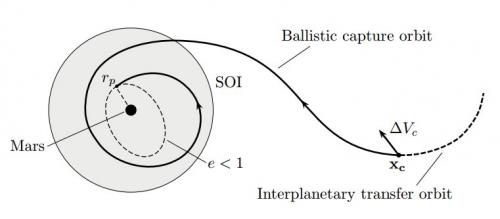 Перелет по орбите Гомана требует определения оптимального времени пусковых окон – когда Земля и Марс максимально сближаются. Поэтому если возникнет задержка, ожидание другого стартового окна может занять до двух лет. В своей работе Топпуто и Бельбруно рекомендуют направлять корабль не напрямую к планете, а к точке впереди планеты на его орбите вокруг Солнца, и ждать пока она подхватит его. Это баллистический захват.