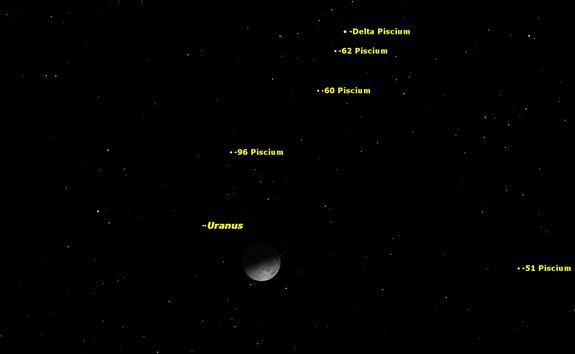 Следует обратить внимание на звезды вокруг Урана и Луны в созвездии Рыб, а именно на звезду под номером 96, прямо над Луной. Из-за вращения Земли кажется, что Луна, Уран и все звезды вокруг движутся по направлению к западному горизонту. Луна также движется, но в противоположном направлении.