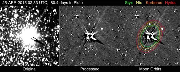 Аппарат «Новые горизонты», который максимально приблизится к Плутону уже 14 июля, сделал ряд снимков за период с 25 апреля по 1 мая, используя камеру Long Range Reconnaissance Imager (LORRI). По словам членов команды миссии, космическому аппарату впервые удалось заснять маленькие спутники Плутона – Кербер и Стикс.