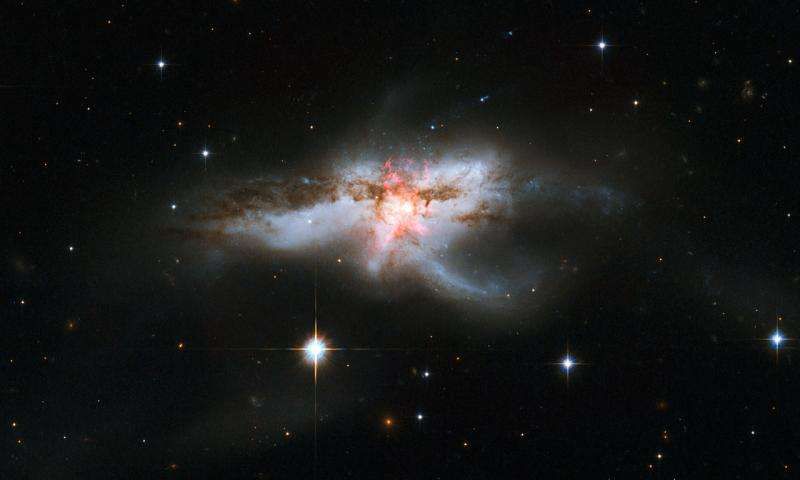 Однако необычную форму галактика имела не с начала своих дней; такой внешний облик является результатом галактического слияния, которое произошло, когда две галактики слишком сблизились друг с другом. Это слияние послужило причиной образования новых звезд и взрыва сверхновых. Сверхновая, не видимая на данном снимке, была обнаружена в этой галактике в 2013 году. Ее название – SN 2013dc.