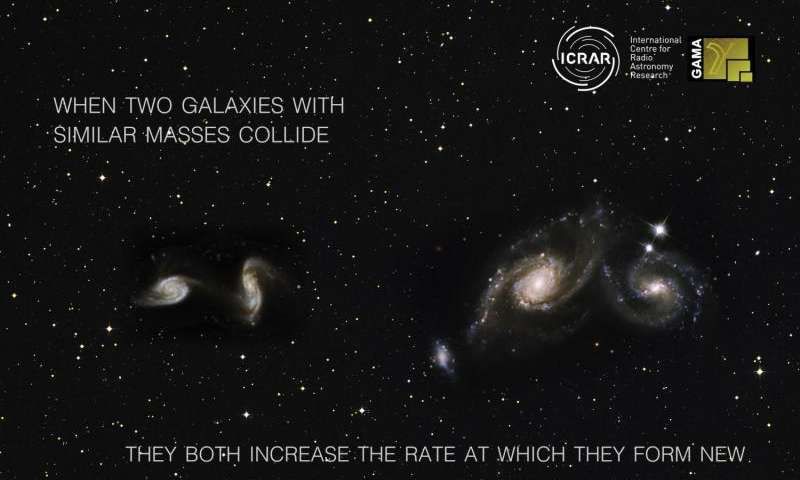 Когда две разные по размерам галактики сталкиваются друг с другом, большая галактика останавливает процессы образования новых звезд в меньшей. Об этом говорят результаты нового исследования. Кроме того, согласно ним, если сталкиваются две галактики одинакового размера, то в обеих из них процессы звездообразования протекают более быстрыми темпами.