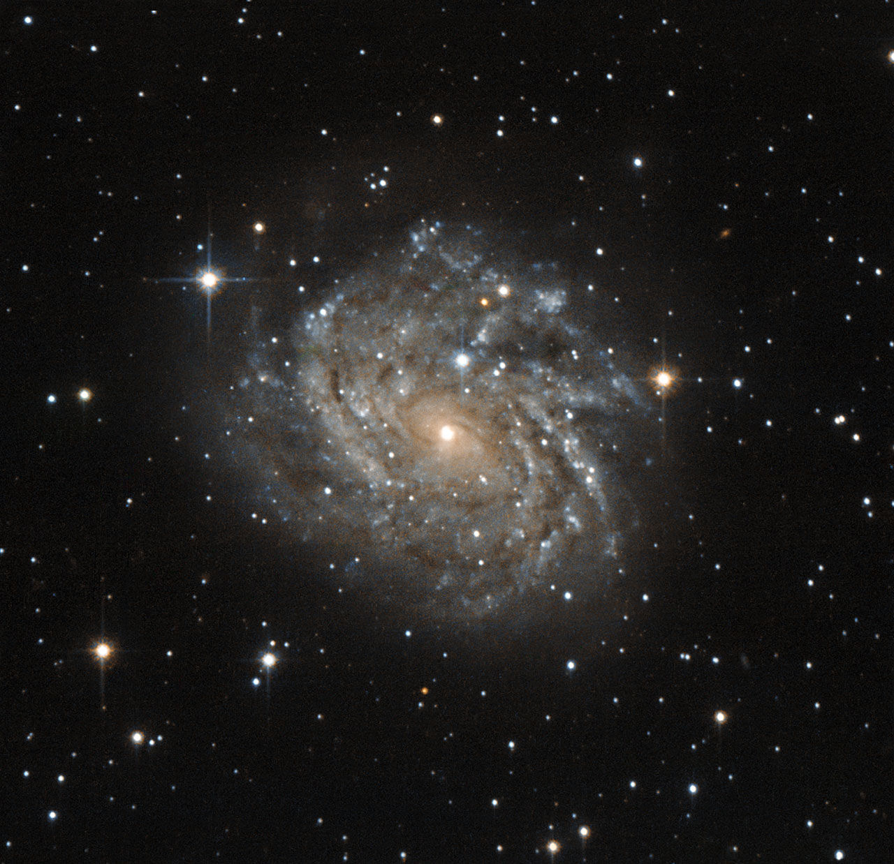 Галактика, имеющая форму диска, видна «сверху», что позволяет в деталях рассмотреть закручивающиеся к центру структуры спиральных рукавов. Темные пятна на этих спиральных рукавах представляют собой, по сути, газ и пыль – сырьевые материалы для новых звезд.