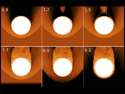 Астрофизики Института создали модели красных гигантов схожие с теми, что, как полагают, пропали из галактического центра – звезды возрастом в миллиарды лет и в десятки раз больше нашего Солнца. Они прогнали их через компьютерную реализацию аэродинамической трубы для симуляции столкновений с газовым диском, который однажды занимал большую часть пространства в 0,5 парсеках от центра галактики. Исследователи изменяли орбитальную скорость и плотность диска, чтобы вычислить условия, необходимые для нанесения непоправимого ущерба красным гигантам.