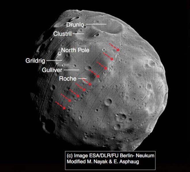 Некоторые из таинственных желобов на поверхности марсианского спутника Фобоса являются результатом бомбардировки поверхности Фобоса осколками, выбрасываемыми в космос при его столкновениях с астероидами, а затем возвращающимися обратно на поверхность и формирующими линейные цепи кратеров согласно новому исследованию.