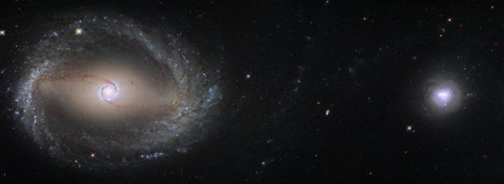 Гравитационный «танец» двух галактик, расположенных в близлежащей части Вселенной, привел к формированию в каждой из взаимодействующих галактик интересных особенностей, которые видны на этом новом снимке, полученном при помощи космического телескопа НАСА/ЕКА Hubble. Крохотная галактика NGC 1510 и соседняя с ней гигантская галактика NGC 1512 находятся на начальном этапе столкновения, которое будет протекать еще очень долго. Несмотря на свой крохотный размер, галактика NGC 1510 оказывает существенное влияние на структуру галактики NGC 1512 и скорость звездообразования в ней.