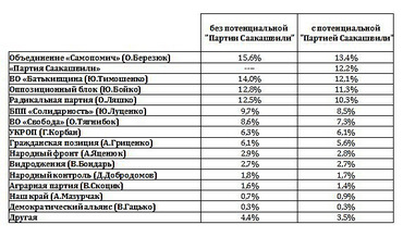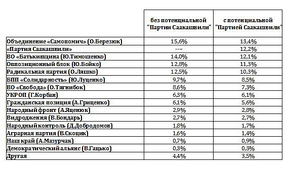 Варианты голосования за список партий без участия потенциального блока Саакашвили и с его участием показывают, что его политическая сила заберет голоса у других лидеров политического процесса практически равномерно ("Самопомощь" – 2,2%, "Батькивщина" – 1,9%, "Оппозиционный блок" – 1,5%, Радикальная партия – 2,2%, "Солидарность" 1,2%, "Свобода" – 1,3%, "Укроп" – 0,2%, "Гражданская позици"я – 0,5%).