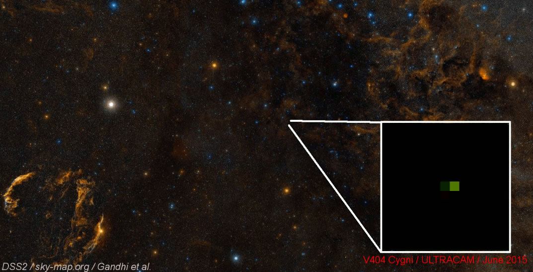 В июне 2015 г. черная дыра под названием V404 Лебедя разразилась яркой вспышкой, которая длилась в течение примерно двух недель, по мере того как черная дыра поглощала материю, перетягиваемую ею со звезды-компаньона, составляющего с черной дырой двойную систему.