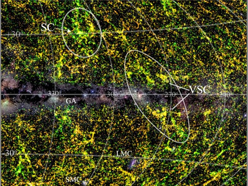 Сверхскопления галактик являются крупнейшими и наиболее массивными структурами во Вселенной. Они состоят из скоплений галактик и галактических нитей, протянувшихся на расстояния до 200 миллионов световых лет. Самое известное сверхскопление галактик носит название сверхскопления Шепли (обозначено как SC на снимке), находится на расстоянии примерно 650 миллионов световых лет от нас и содержит примерно пару десятков массивных скоплений галактик, излучающих в рентгене. Для тысяч галактик, входящих в эти скопления, к настоящему времени были надежно измерены скорости галактик. Считается, что это сверхскопление галактик является самым крупным в своем роде в нашей космической округе.