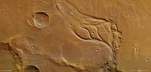 Великолепные острова и узкие ущелья, образованные быстрым водным потоком, отчетливо видны на небольшой области плато вблизи юго-восточной окраины гигантской системы марсианских каньонов Valles Marineris (Долины Маринер).