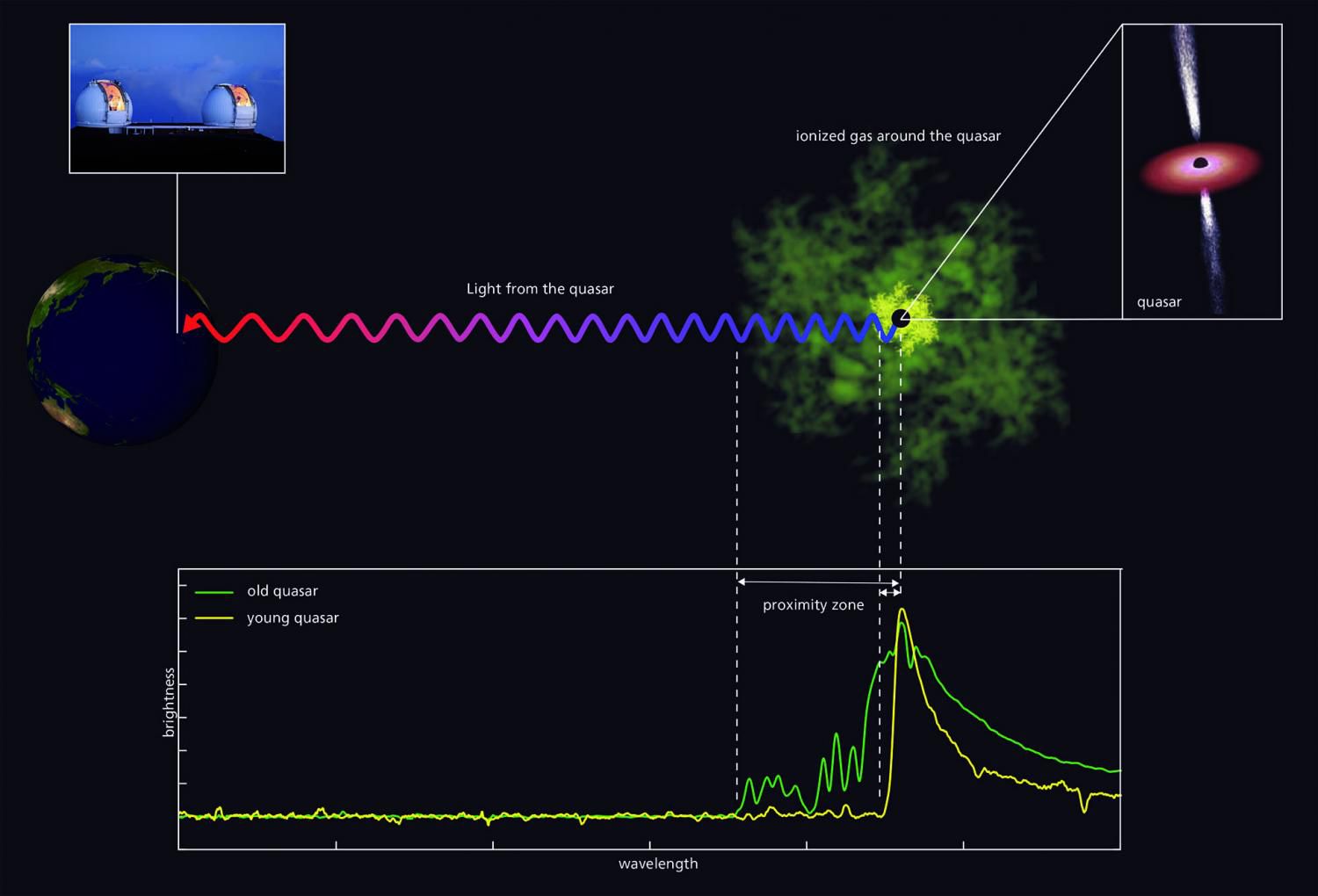 Квазары представляют собой светящиеся объекты, в центрах которых расположены черные дыры, наблюдаемые через гигантские космические расстояния. Падающая на черную дыру материя увеличивает массу черной дыры и вызывает свечение квазара. В новой работе астрономы во главе с Кристиной Эйлерс (Christina Eilers) из Института астрономии Общества Макса Планка (Max Planck Institute for Astronomy, MPIA) при помощи обсерватории им. Кека, расположенной на Гавайях, открыли экстремально молодые квазары с необычным свойством: эти квазары смогли набрать массу, оцениваемую примерно в один миллиард масс Солнца, менее чем за 100000 лет. Согласно существующим моделям квазарам потребовалось бы примерно в 1000 раз больше времени, чтобы набрать такую массу, поэтому эти находки представляют большую загадку для ученых.