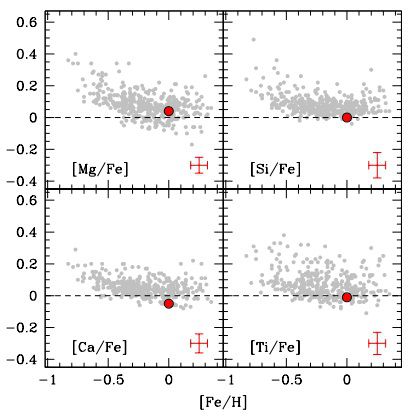 Результаты этого исследования стали неожиданностью для ученых. Выяснилось, что содержание железа и других элементов (красные точки на фото) в звездах скопления Гея 1 близко к соответствующим содержаниям этих элементов в веществе нашего Солнца, следовательно, вероятнее всего, это скопление имеет внутригалактическое происхождение и представляет собой рядовое открытое скопление звезд, сформировавшееся из газа, обогащенного теми же химическими элементами, что и газ тонкого диска (состав вещества звезд тонкого диска - поля серых точек на фото) Млечного пути. Таким образом, гипотеза о внегалактическом происхождении этого скопления звезд по результатам данного исследования не подтвердилась.