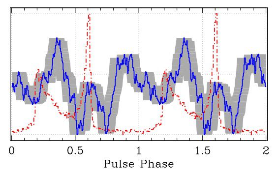 «Мы сообщаем об обширных дополнительных наблюдениях пульсара на частоте 327 мегагерц при помощи радиотелескопа Ooty. Используя полученные ранее характеристики этого объекта в радиодиапазоне и проведя дополнительные наблюдения в течение 60 часов, мы получили подтверждение обнаружения пульсара в радиодиапазоне (сплошная синяя линия на графике; прерывистая красная линия - профиль пульсара в гамма-диапазоне) с доверительной вероятностью 99,82 процента», указывают авторы в своей работе.