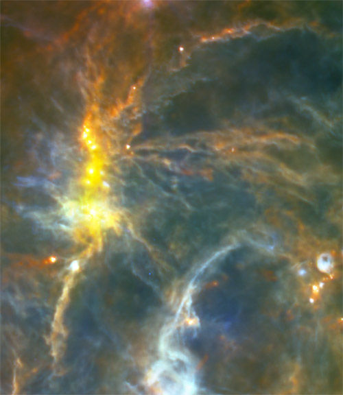 Изучение молекулярных облаков показало, что звездообразование обычно протекает в два этапа. Сначала потоки материи, движущейся со сверхзвуковыми скоростями, сжимают облака в плотные филаменты, тянущиеся в длину на несколько световых лет, после чего гравитация приводит к коллапсу наиболее плотной части материала в отдельные ядра. В этом сценарии массивные ядра (массой свыше 20 масс Солнца) преимущественно формируются в узлах, где пересекается несколько филаментов – там зарождаются будущие скопления звезд. Этот механизм представляется довольно наглядным, однако на самом деле наблюдаемая скорость звездообразования в облаках плотного газа составляет лишь несколько процентов от скорости, рассчитанной в допущении о свободном коллапсе материала. Для решения этой проблемы астрономы предположили, что магнитные поля воздействуют на ядра звезд, сдерживая их гравитационный коллапс.