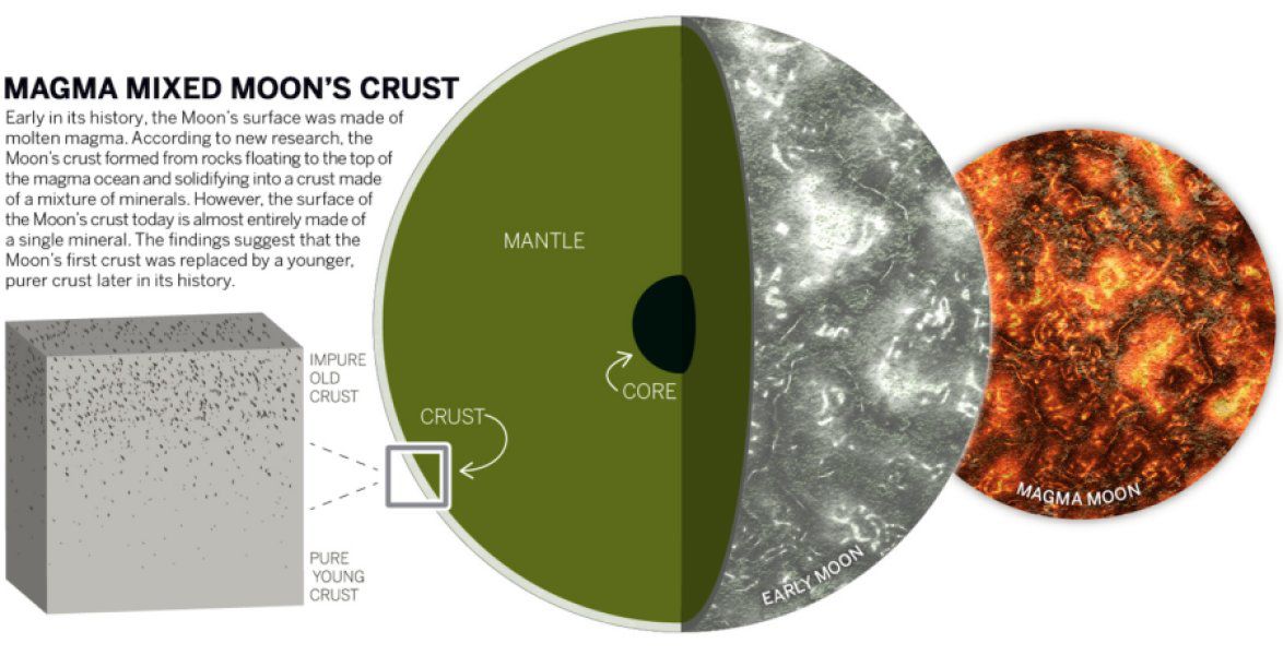 При определении минерального состава вещества поверхности Луны исследователи с удивлением обнаружили, что она состоит почти полностью (на 98 процентов) из одного минерала – плагиоклаза. Для объяснения этого факта была предложена гипотеза, согласно которой слой плагиоклаза «всплывает» в океане магмы в ранние годы формирования Луны, чтобы затем при кристаллизации дать почти чистый минерал, покрывающий собой всю поверхность естественного спутника Земли.