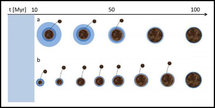 Согласно этой модели Марс и Венера развиваются из протопланет (а те, в свою очередь – из облаков газа и пыли). «Зародыши» планет сталкиваются и формируют таким образом протопланеты. Эти протопланеты разогреваются, и на их поверхностях формируются океаны магмы. При затвердевании этих океанов магмы летучие вещества формируют толстую и горячую атмосферу, которая в основном состоит из воды и диоксида углерода.