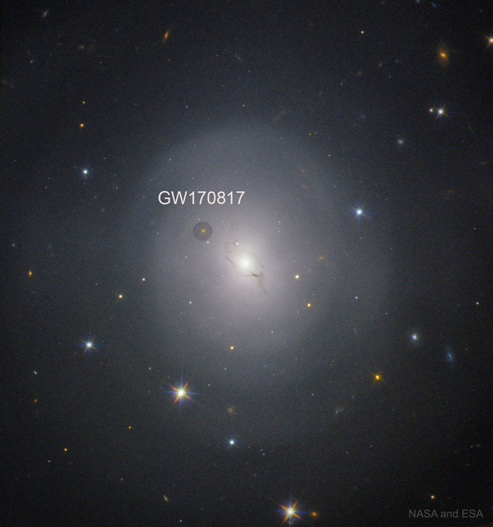 Событие GW170817 представляет собой объединение двух нейтронных звезд, для которого были зафиксированы не только гравитационные волны, но и сопровождающее их электромагнитное излучение в диапазоне от рентгена до радиоволн. Благодаря этому электромагнитному излучению, стало возможным определить расстояние до родительской галактики этой пары черных дыр под названием NGC4993, которое составило 140 миллионов световых лет. Эта галактика движется в направлении от нас, поскольку наша Вселенная расширяется, и радиальная скорость галактики может быть измерена по смещению ее спектральных линий. Зная, как далеко от нас находится эта галактика и с какой скоростью она движется, ученые смогли рассчитать, сколько времени прошло с начала расширения Вселенной – то есть, возраст Вселенной. Согласно Бланшарду возраст Вселенной составляет от 11,9 до 15,7 миллиарда лет, учитывая неопределенности, связанные с экспериментом.