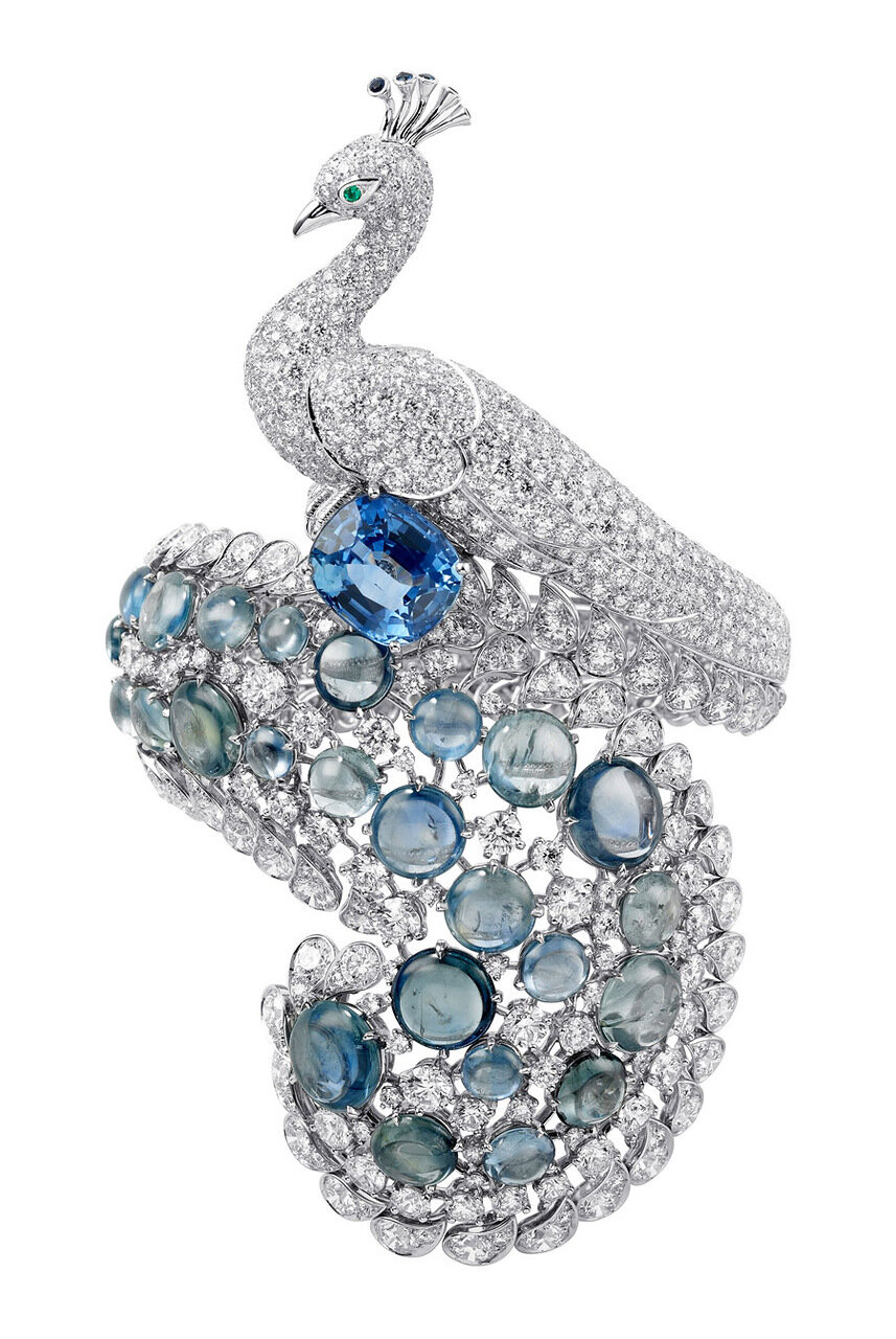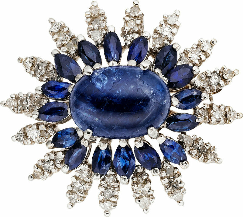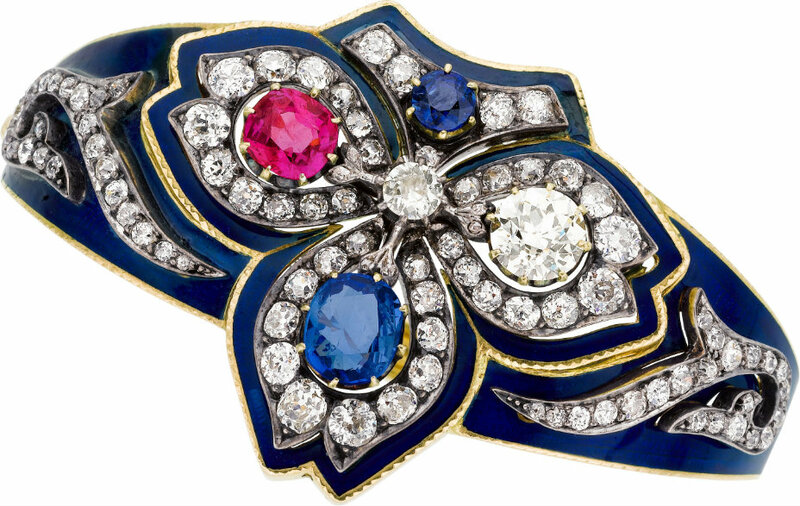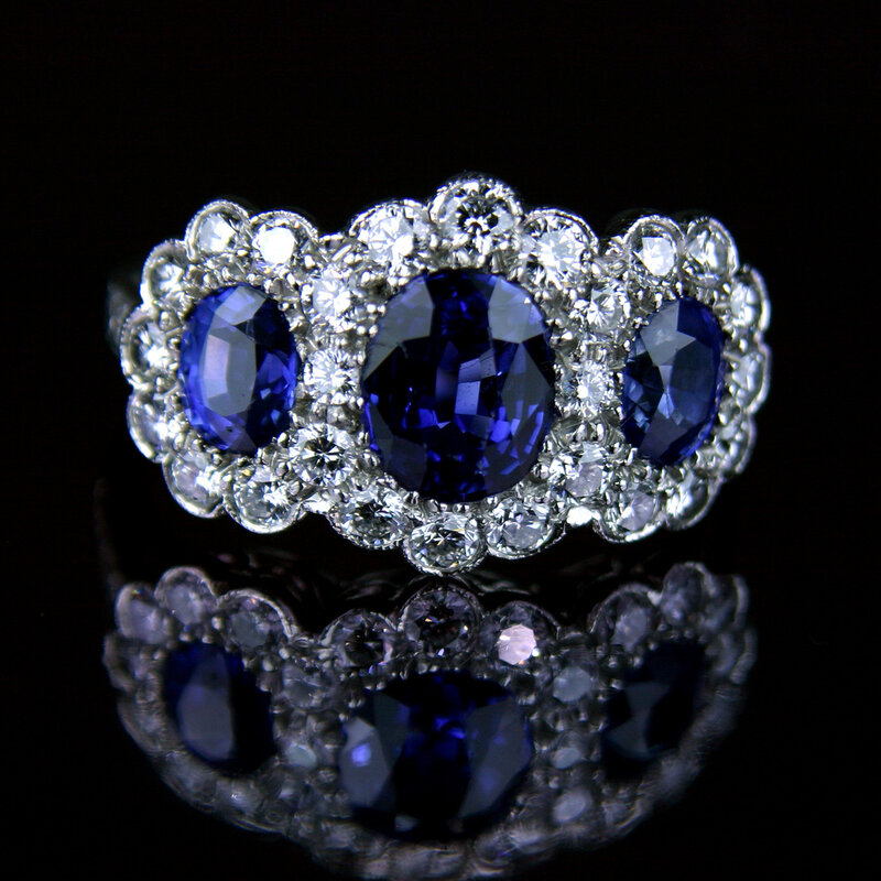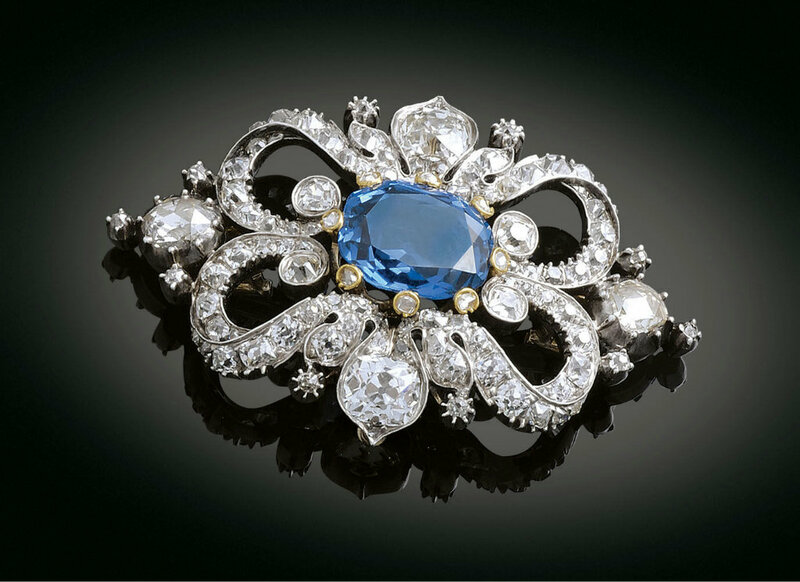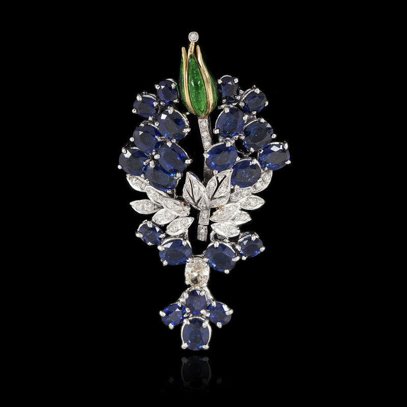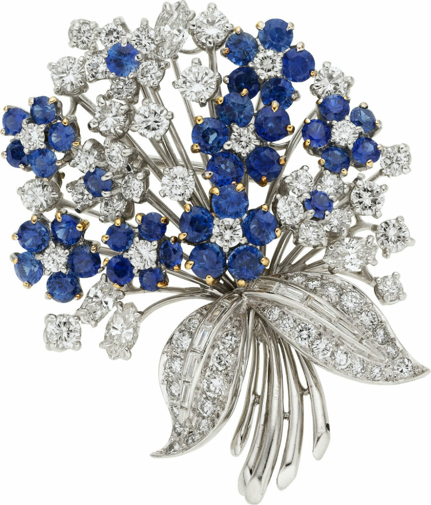 Платина, бриллианты, сапфиры.