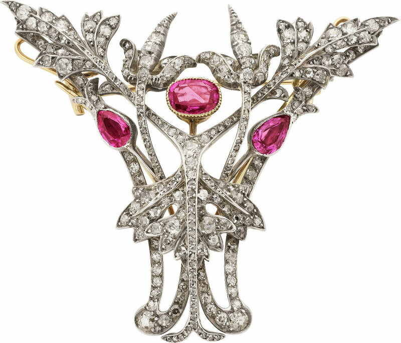 Антикварная брошь. Золото, серебро, розовый сапфир, бриллианты.