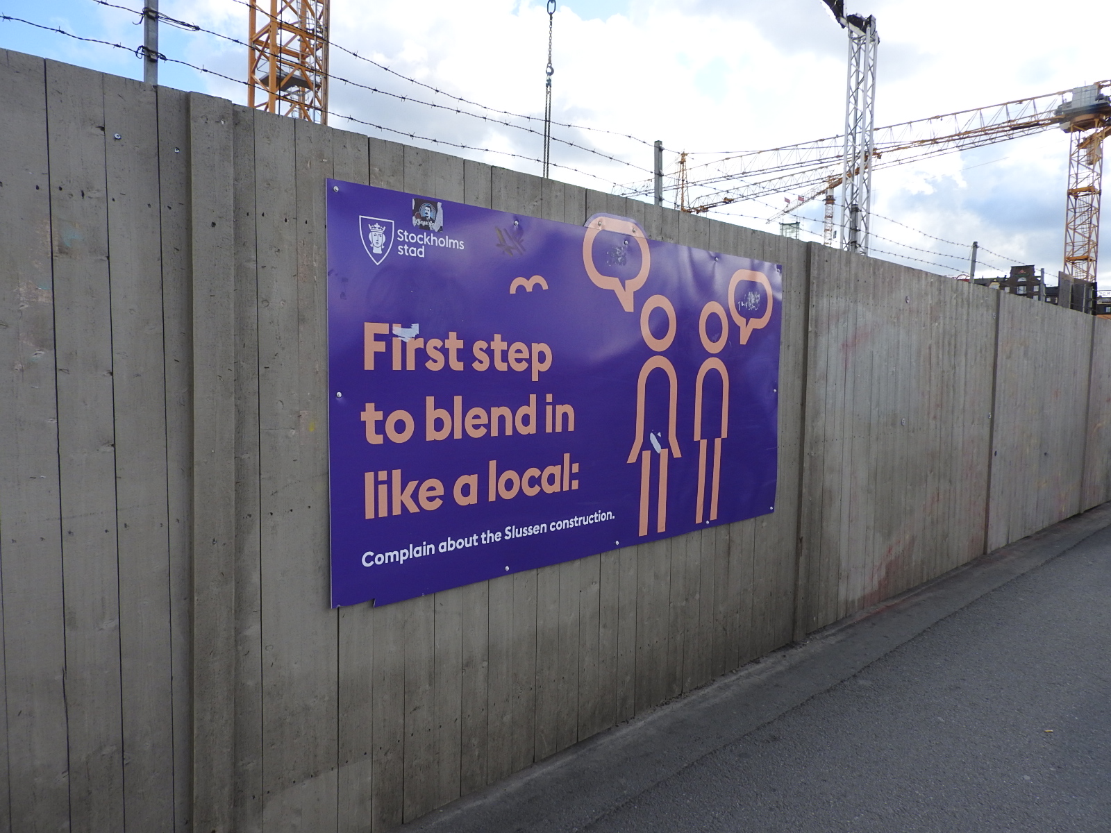 По пути по этому случаю висит плакат ("Как сойти за местного - жаловаться на реконструкцию Слюссена"):