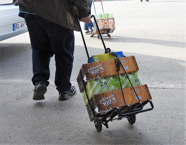 Покупают это всё финны и везут домой в огромных количествах. Наши не пьют, как раньше, да спиртное у нас дешевле. Хотя надо было купить для галочки бутылочку Вана Таллина или ягодного ликера, но я не стала. А вот так финны сходят с таллинского парома в Хельсинки: